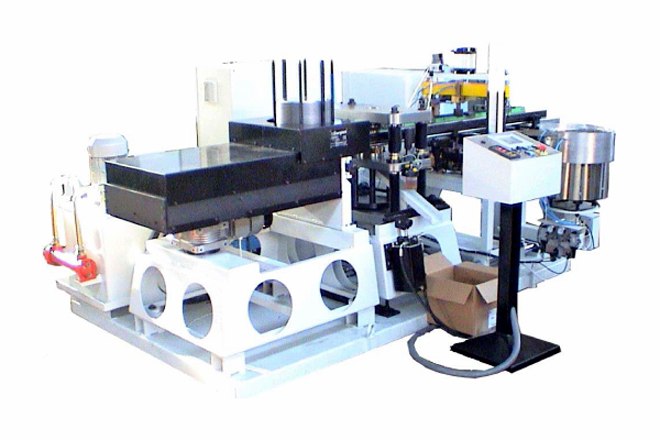 Macchina automatica che nella versione base è composta dallo sfogliatore per coperchi e dalla testa di saldatura; i coperchi sono trasferiti dallo sfogliatore alla testa tramite carrello a passo. A seconda del tipo di produzione, la macchina può essere equipaggiata con due presse oleodinamiche, che si posizionano tra lo sfogliatore e la testa di saldatura. La prima pressa può essere utilizzata per l’esecuzione del foro per l’applicazione del tappo sul coperchio, mentre la seconda per la rivettatura del tappo se richiesto. L’alimentazione dei cavallotti avviene tramite vibratori, mentre le maniglie sono reinserite su caricatori a spada. Nel caso in cui sia prevista la produzione di coperchi con cavallotti di diverso tipo, la macchina può essere dotata di carrelli porta vibratori, che permettono una rapida sostituzione di tutto il gruppo di alimentazione.